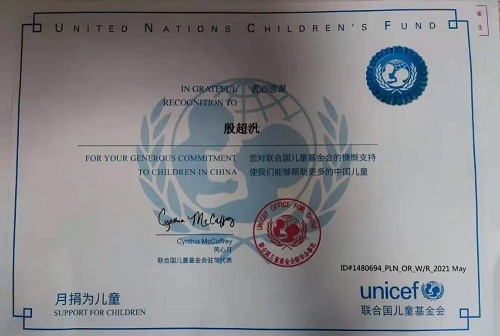 据了解,自2021年3月以来至今,每个月石家庄同创铁路学校学生殷超汎都会为联合国儿童基金会捐款,用于支援中国西部边远地区的贫困儿童。联合国儿童基金会“为儿童月捐”计划自2010年开展以来,一直致力于为所有面临疾病、残疾、留守、单亲、贫困等问题的儿童及其家庭提供急需的福利支持。