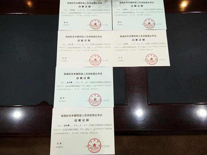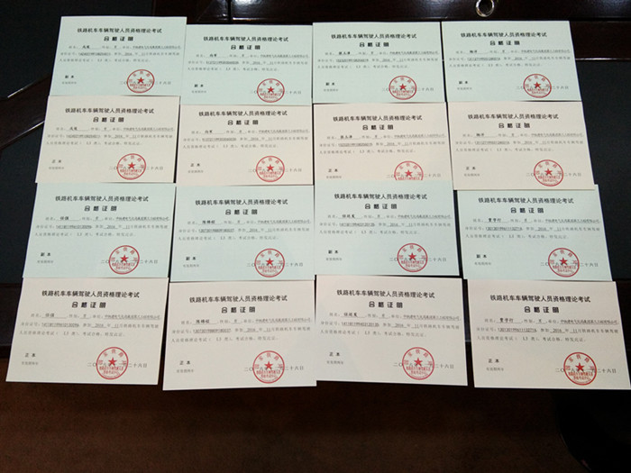 轨道车专业学生陈锦程、任强、戌俊、石红贤、马瑞东、向军、杨洋、赵延麟、任廷发、贾字行、张玉泽、李笑亮等人,已顺利通过国家铁路局“铁路机车车辆驾驶人员资格理论考试”,现已获得铁路局颁发的考试合格证书。