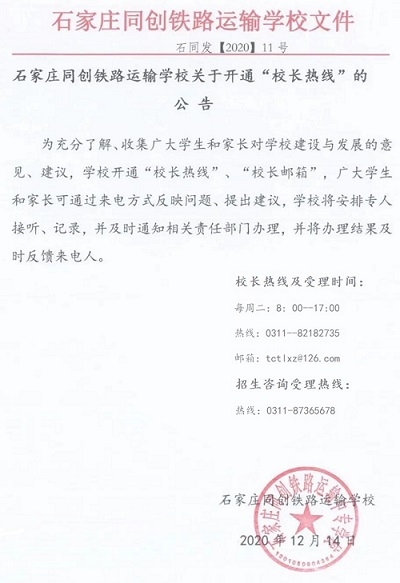 石家庄同创铁路运输学校关于开通“校长热线”的公告