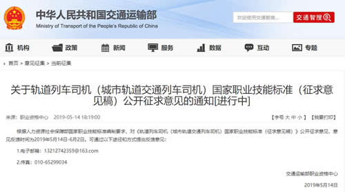 根据人力资源社会推荐部国家职业技能标准编制要求,对《轨道列车司机(城市轨道交通列车司机)国家职业技能标准(征求意见稿)》公开征求意见,意见反馈时间为2019年5月14日-6月2日。可通过以下途径和方式提出反馈意见: