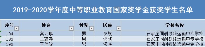 近日,教育部公布了2019-2020年度中等职业教育国家奖学金获奖名单,其中石家庄同创铁路运输中专学校3名学生获得2019-2020年度中等职业教育国家奖学金。国家奖学金每人奖励6000元,现予公告:
