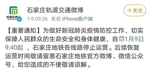 为做好新冠肺炎疫情防控工作,切实推荐人民群众的生命安全和身体健康,自1月9日9:40起,石家庄地铁各线路停止运营。后续恢复运营时间敬请留意石家庄地铁官方微博、微信公众号,给您造成的不便敬请谅解。