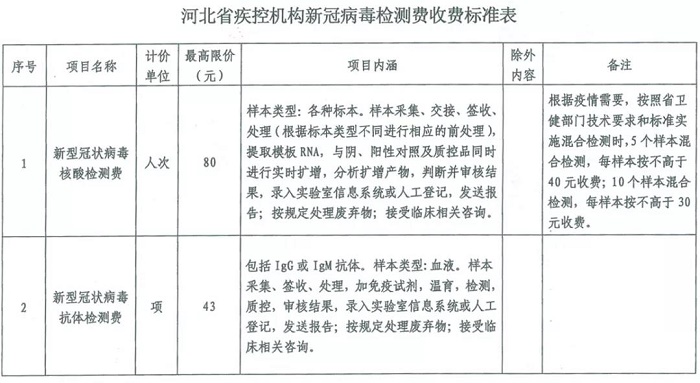 为进一步做好常态化疫情防控工作,规范检测收费行为,减轻广大群众负担,2021年2月3日,河北省发展和改革委员会、河北省财政厅、河北省卫生健康委员会联合印发《关于完善疾控机构新型冠状病毒检测收费政策的通知》,就完善新型冠状病毒检测收费政策有关事项通知如下: